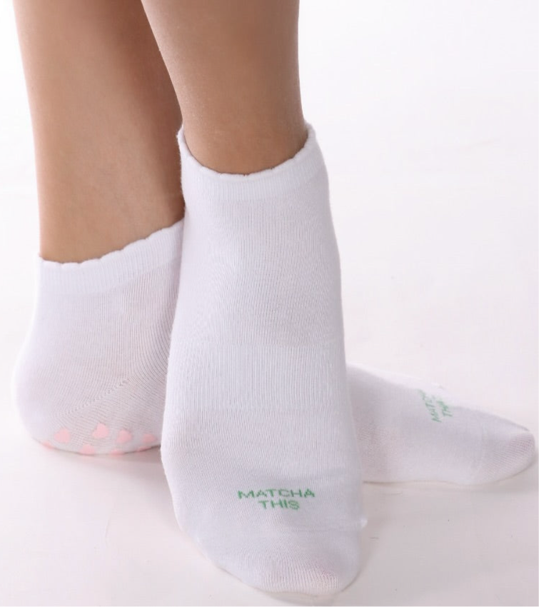 Steeped in style and sprinkled with love — our Matcha Mood this & that Socks are the perfect blend of calm and cute. With “Matcha This / Matcha That” embroidered on the toes and blush-pink heart grips on the sole, these socks are a must for every mat sesh or matcha run.